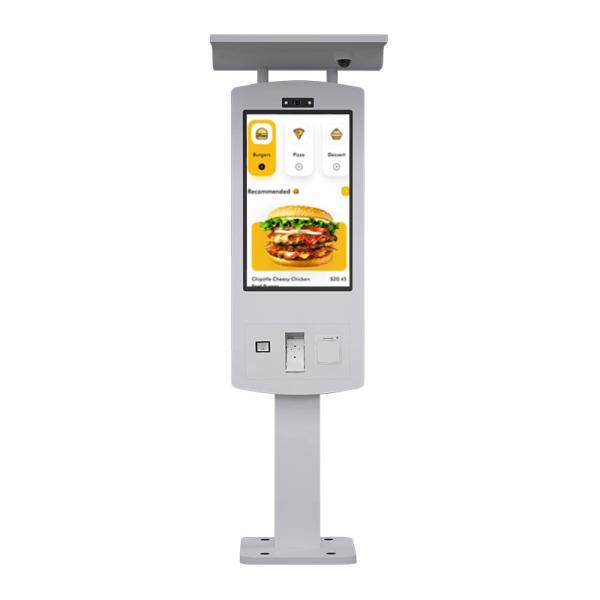 This is outdoor standard automatic self service payment machine pos terminal, can be used for drive through restaurant, has a cover on top for decoration, 2000nits high brightness with light sensor to save consumption power, galvanized steel with waterproof powder painting structure and air cooling fans system insid for dissapation.